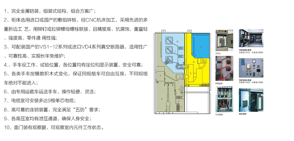 2、本開關柜具有防止帶負荷推拉斷路器手車,防止誤分合斷路器、防止接地開關處于閉合位置時關合斷路、防止誤入帶電隔室、防止在帶電時誤合接地開關的聯鎖功能,既可配用VS1真空斷路器,又可配用ABB公司的VD4真空斷路器,是一種性能優越的配電裝置。